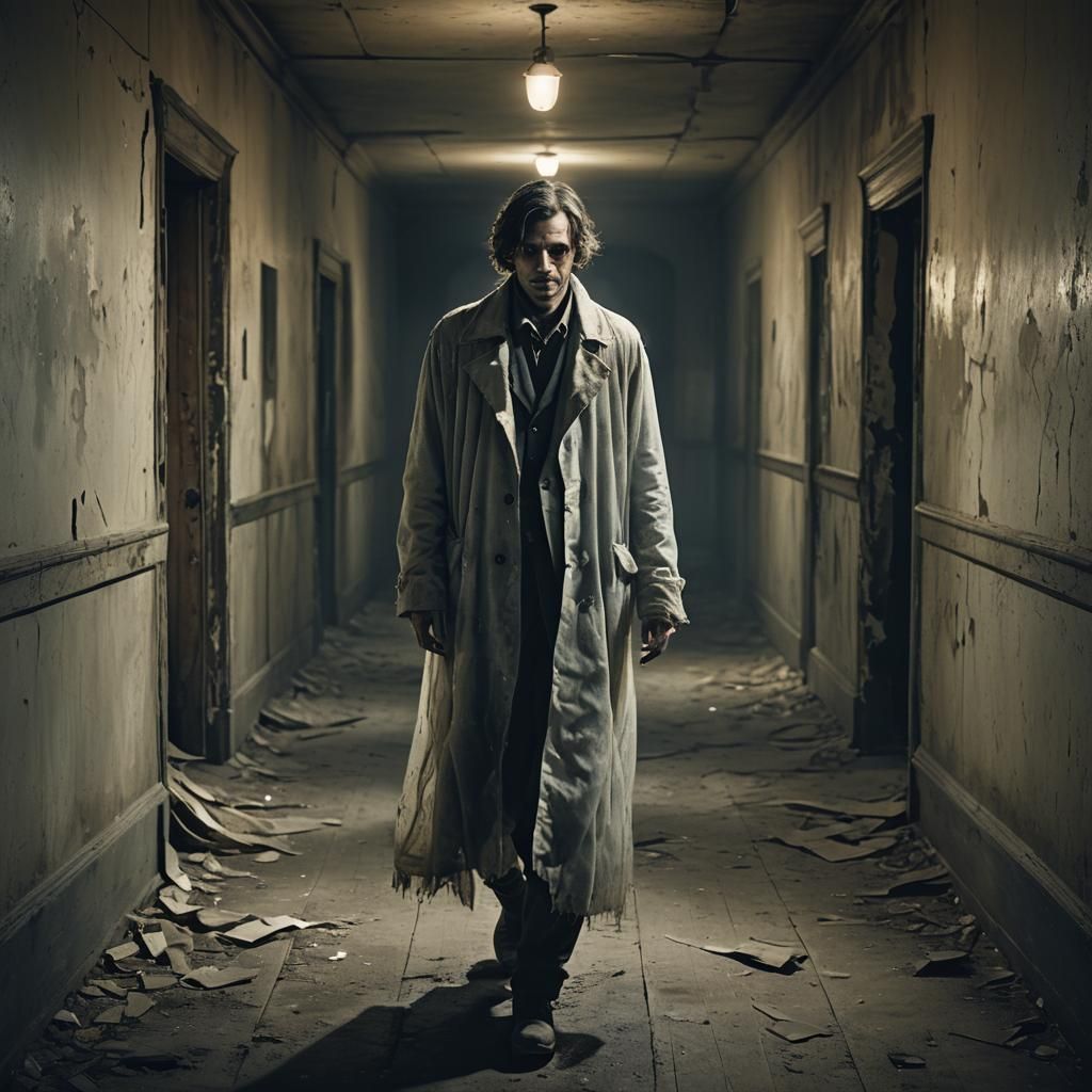 A haunting image of a translucent figure in an abandoned hallway, reminiscent of surrealist art. Eerie candlelight and mist create a melancholic atmosphere in muted, monochromatic tones.