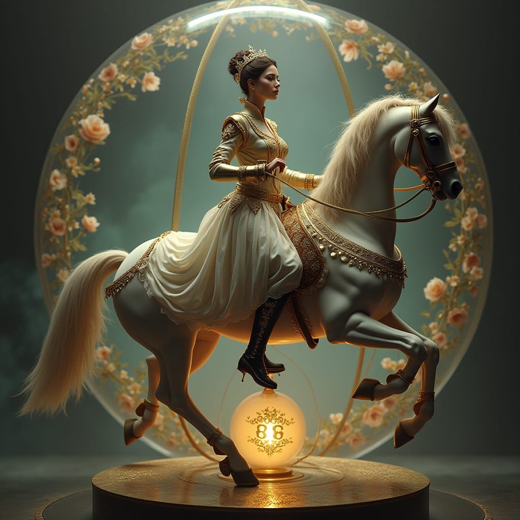 Uma linda mulher soldado com traje tipico de guerra, equilibrando-se sobre uma corda bamba esticada dentro de um gigantesco cavalo de troia de vidro ornamentado, com várias cores brilhantes e espirais, enquanto uma torneira antiga jorra pétalas de flores em caracóis que se desenrolam no ar, e no centro ...