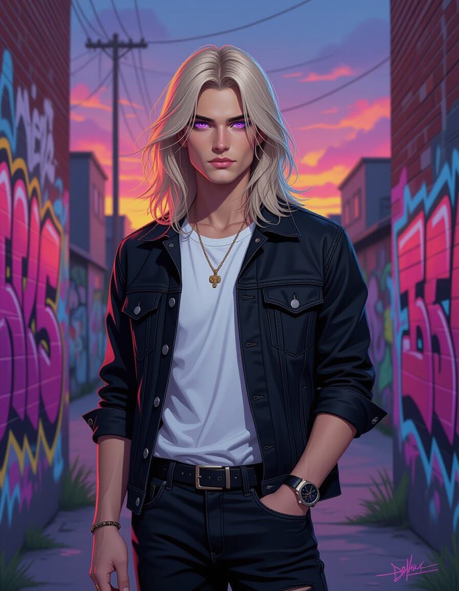 A digital portrait of an androgynous person with long blonde hair and purple eyes, standing at twilight amid vibrant graffiti. The artwork blends splash and street art aesthetics in high contrast with a polychromatic palette.