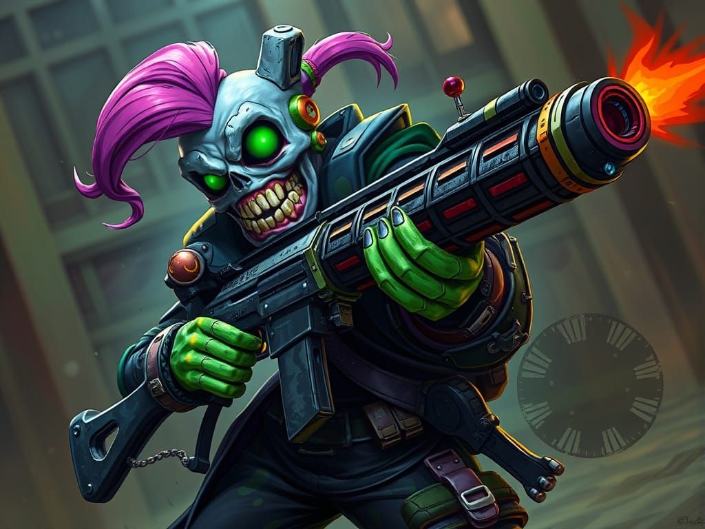 This image shows Jinx from League of Legends holding a bazooka. The scene is rendered with bold colors and high detail, creating a ghoulpunk aesthetic.