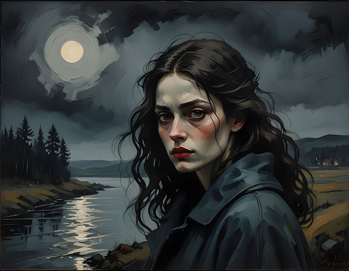 A moody oil painting of Sabrina, goddess of the River Severn. The image, rendered with heavy brushstrokes, creates a surreal and minimalist portrait on aged canvas in a noir aesthetic.