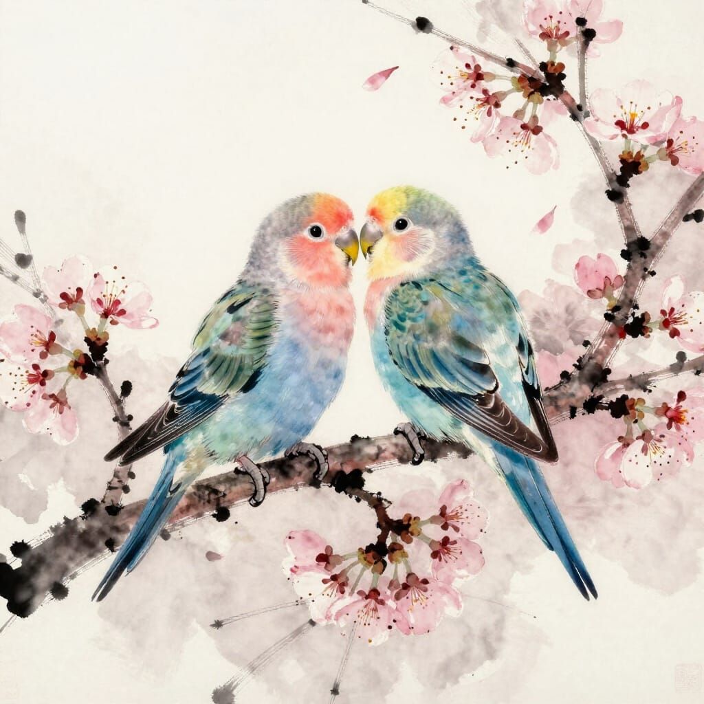 This image features pastel lovebirds on a cherry blossom branch, forming a heart shape with their heads. Rendered with bold strokes, delicate lines, and ink washes on textured rice paper, it evokes a majestic atmosphere.