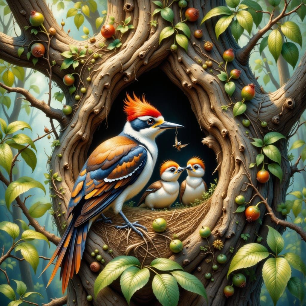 This image depicts a tender moment between a woodpecker mother and her young, amidst the intricate textures and warm tones of a forest landscape, evoking the realism of wildlife art.