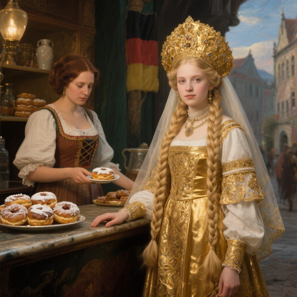 A photorealistic image of the young Tsarina Evdokiya in traditional gold attire with long blonde braid. In the German Quarter, Anna Mons serves doughnuts in 1689, with volumetric lighting and contrasting colors, inspired by realistic details.