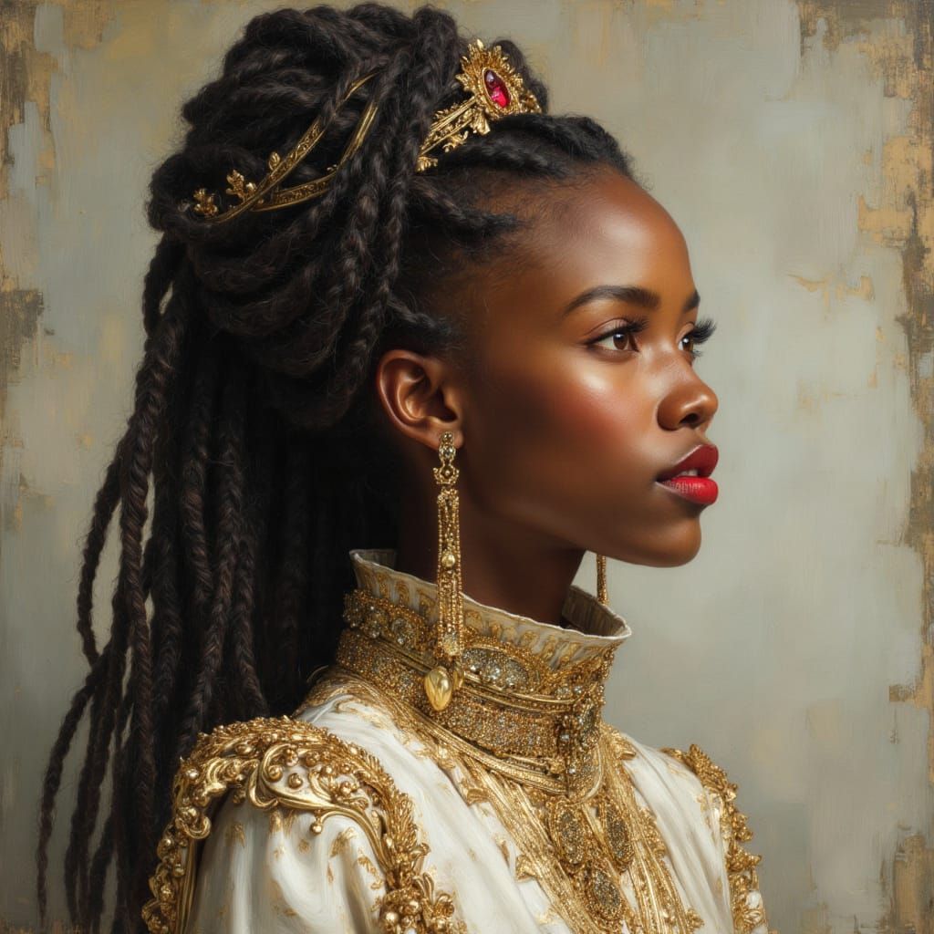 A hyperrealistic portrait of an elegant African goddess in a detailed white and gold traditional dress. Features exquisite braided hair, flawless makeup, and dramatic cinematic lighting, evoking divine oil painting textures.