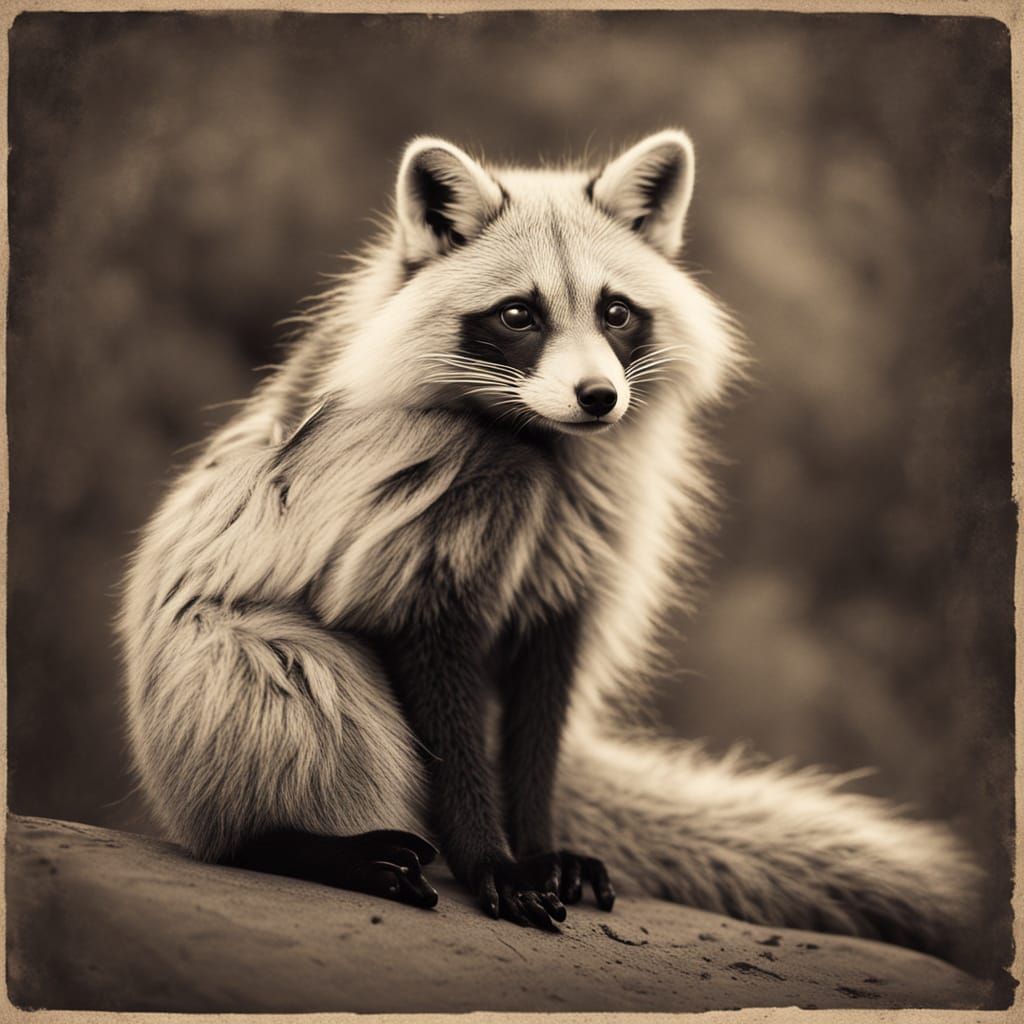 This image shows a beautiful, vintage-inspired portrait of a black fox and white raccoon embracing in perfect harmony, set against a warm, sepia-toned background with soft focus and delicate textures.