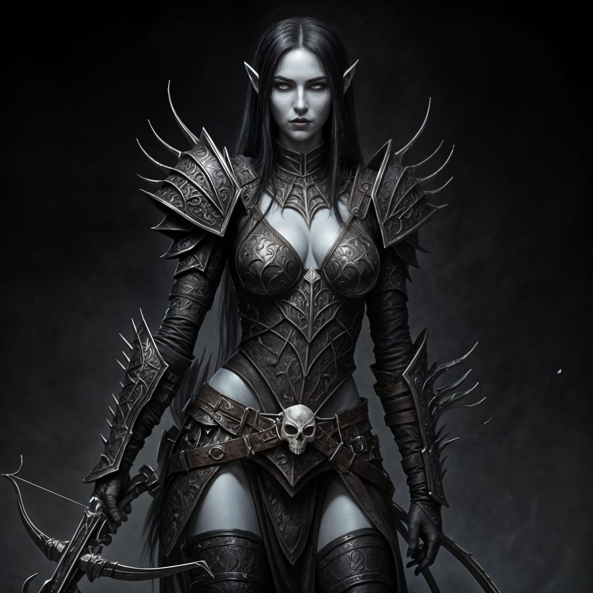This image shows a striking female Drow warrior. She has pale skin and long black hair, wearing dark spiderweb-patterned leather armor, and carrying a bone-decorated hand crossbow.