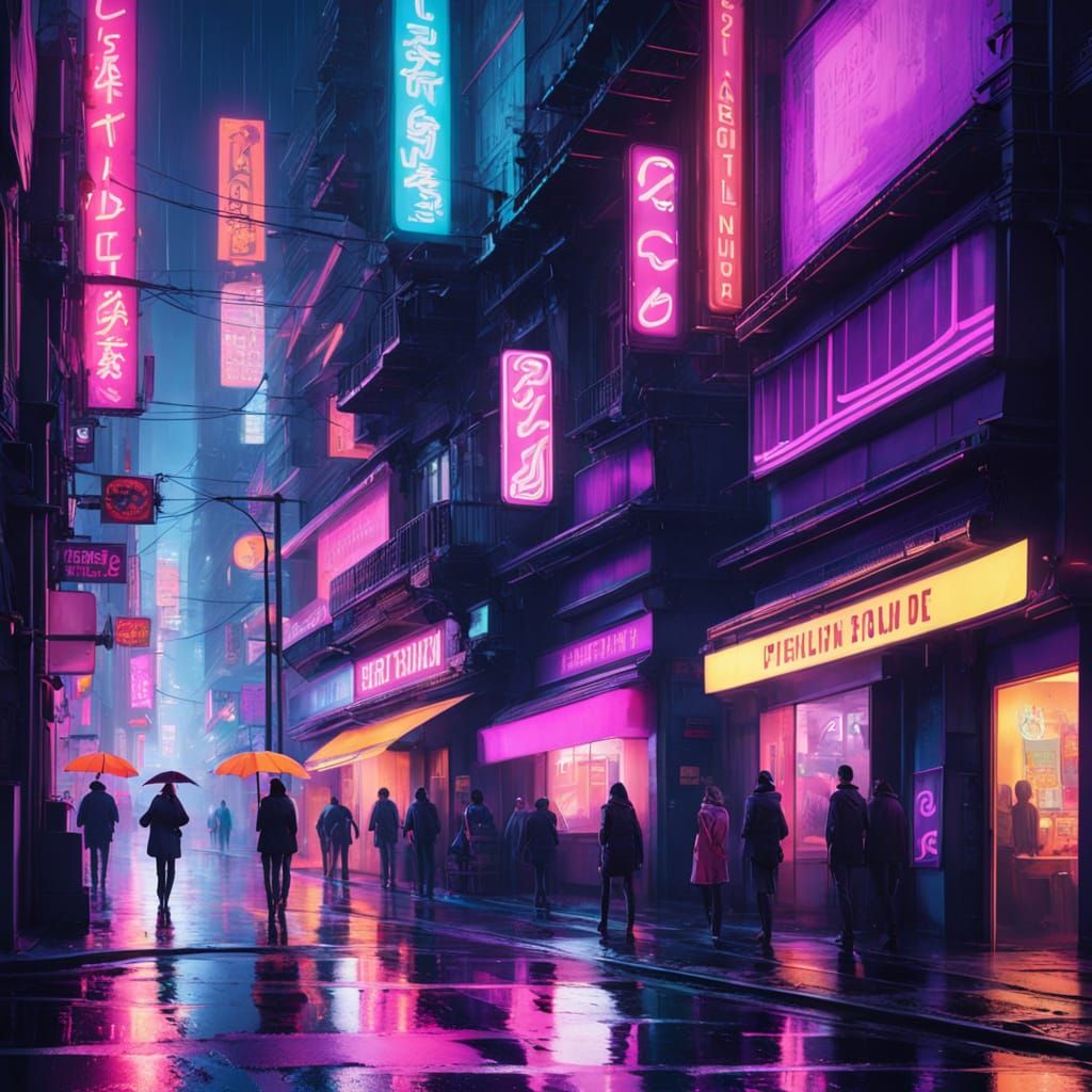 This image captures a futuristic city scene with diverse, sleek buildings and vibrant neon signs reflecting off wet streets, creating a contemplative atmosphere on a rainy night.