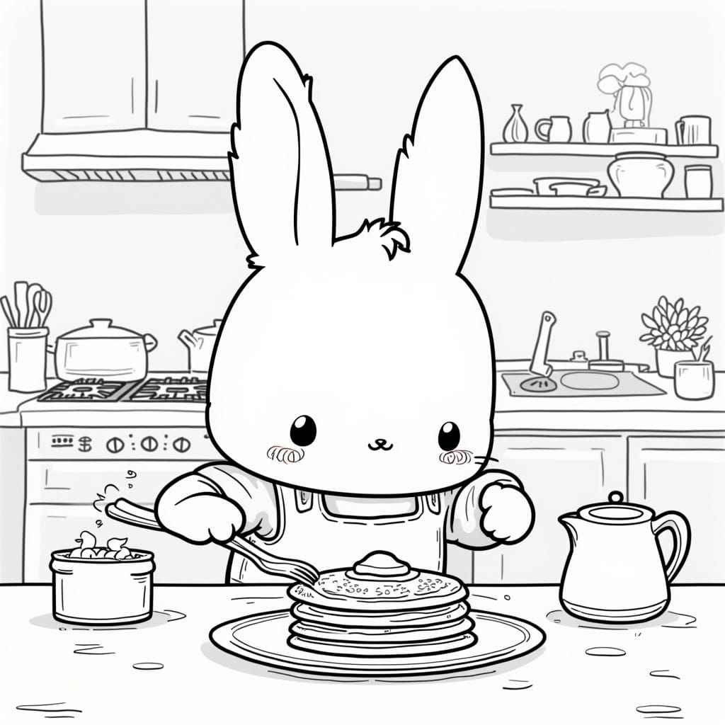 This image shows a cute kawaii animal, possibly a cat or rabbit, happily cooking pancakes in a cozy kitchen. This illustration features simple, clean black outlines in a soft pastel setting.