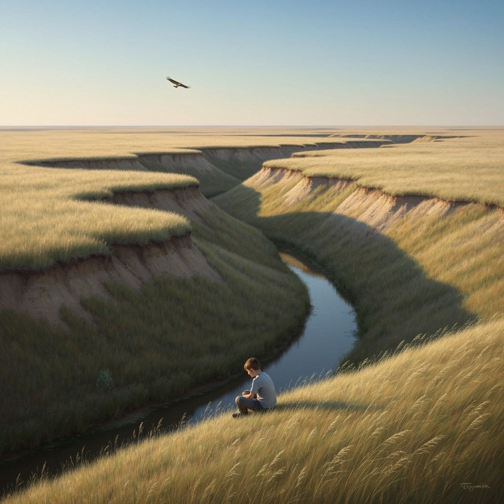 This image depicts a young boy sitting by a prairie coulee, looking at a stream below. Tall grasses sway in the wind under a vast sky, captured in a dramatic landscape painting style.