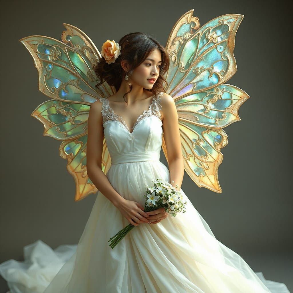 A captivating image of a fairy bride in a white gown, adorned with large iridescent bismuth wings. She holds a bouquet of forget-me-not flowers, rendered in a whimsical, ethereal style.