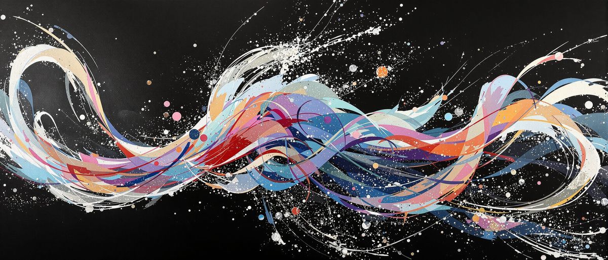 This image depicts a Japanese princess in a dramatic dance with a massive paintbrush. Features iridescent ink, Chinese calligraphy, and minimalist abstract brushstrokes on a black background.