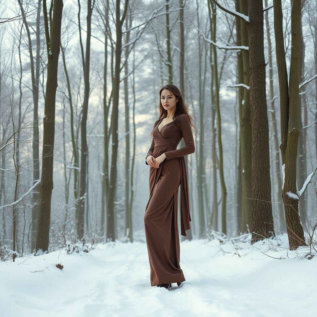 A striking picture of a woman in a white dress in a snowy forest. The image evokes a gentle, serene atmosphere in an art nouveau style.