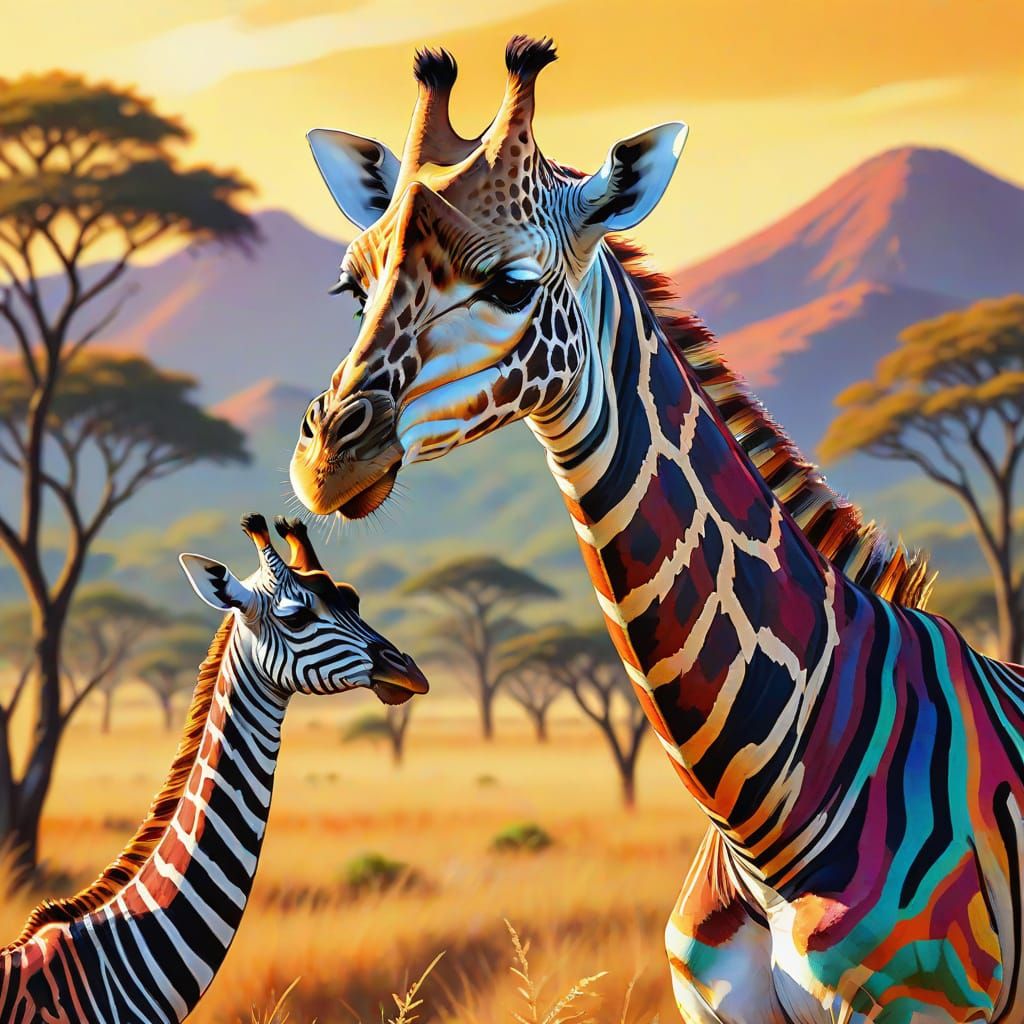 This image shows a giraffe with zebra stripes standing in a savanna. The vibrant digital art features triadic colors, shimmering patterns, and warm golden lighting, creating a detailed and majestic scene.
