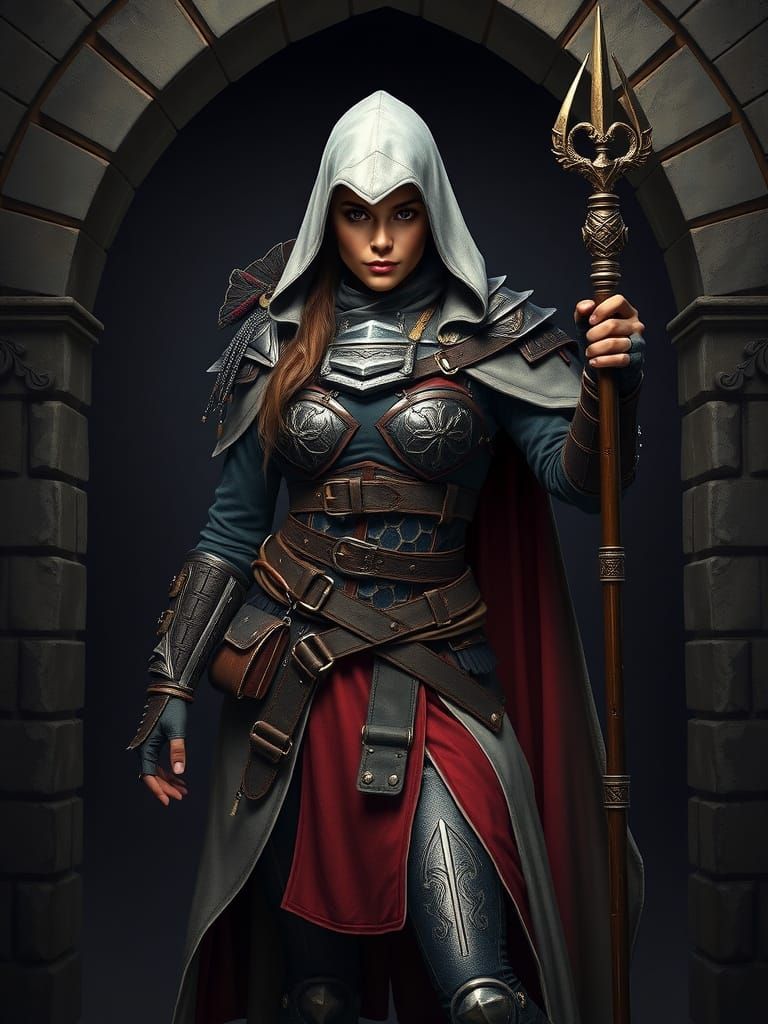 This image depicts a heroic medieval assassin, clad in intricately detailed armor, standing in a dimly lit stone archway. With a staff of power at the ready, she exudes determination and strength, set against a dark, muted background, evoking the cinematic style of Assassin's Creed II.
