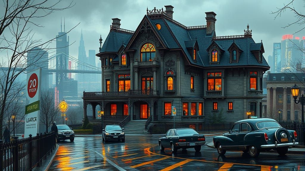 A striking picture of a Victorian mansion overlooking a cyberpunk city. The mansion features intricate carvings and stained glass, juxtaposed against the futuristic cityscape in a painterly style.