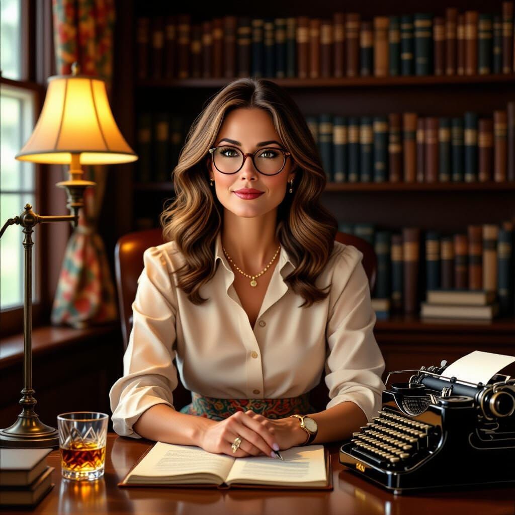 A captivating image of a woman working at a desk in her study. The image is reminiscent of folk art with intricate details and moody lighting.