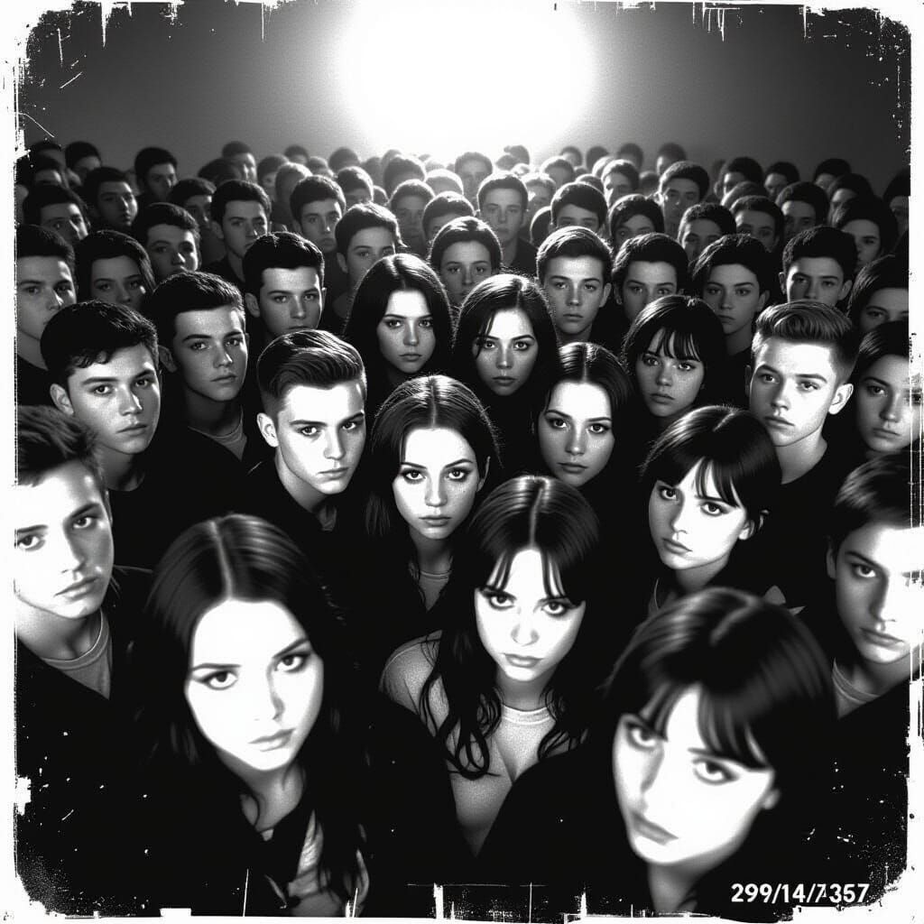 This image captures a grainy, black and white VHS still of unsettling teenagers in a surreal, uncanny valley crowd. The scene evokes a dark, glitchy, and hypnotic atmosphere.