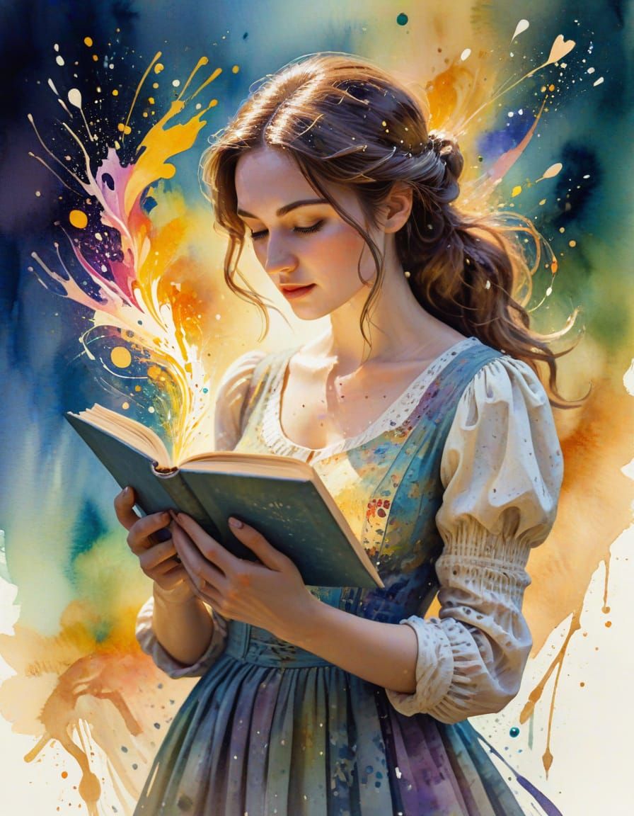 This image shows a woman holding a book as characters come to life around her. The artwork employs vibrant colours, delicate brushstrokes and soft focus in a neo-impressionist style.