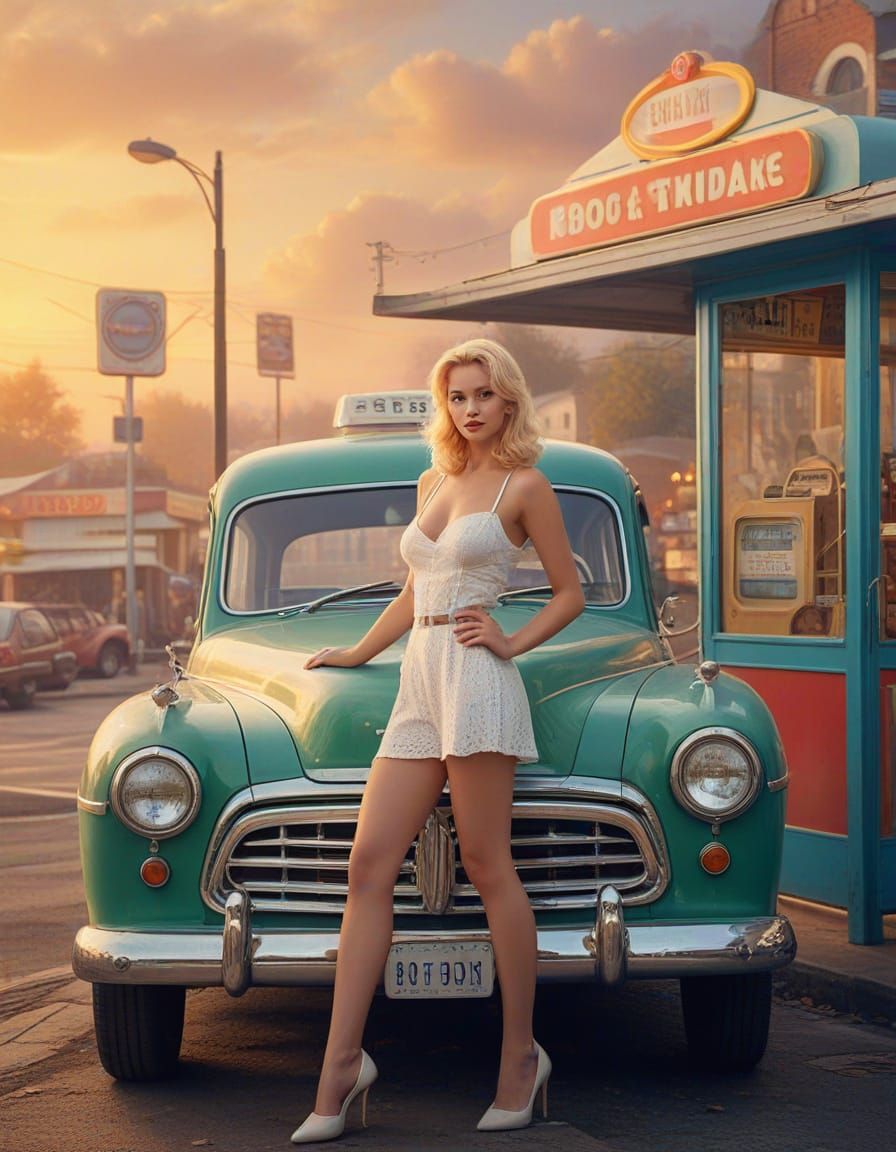 This image shows a vintage poster of a blonde pin-up posing at a gas station, complete with an old city bus. The artwork has a nostalgic feel, with soft mist and warm golden lighting reminiscent of a Thomas Kinkade painting.