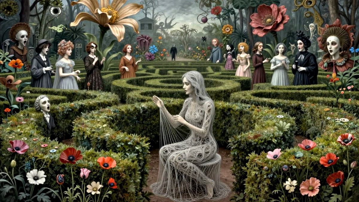 This surreal image depicts a woman made of strings in a hedge maze with blooming and fading poppies. Gothic statues emerge from the foliage, creating a dreamlike scene with muted colors and cosmic accents.