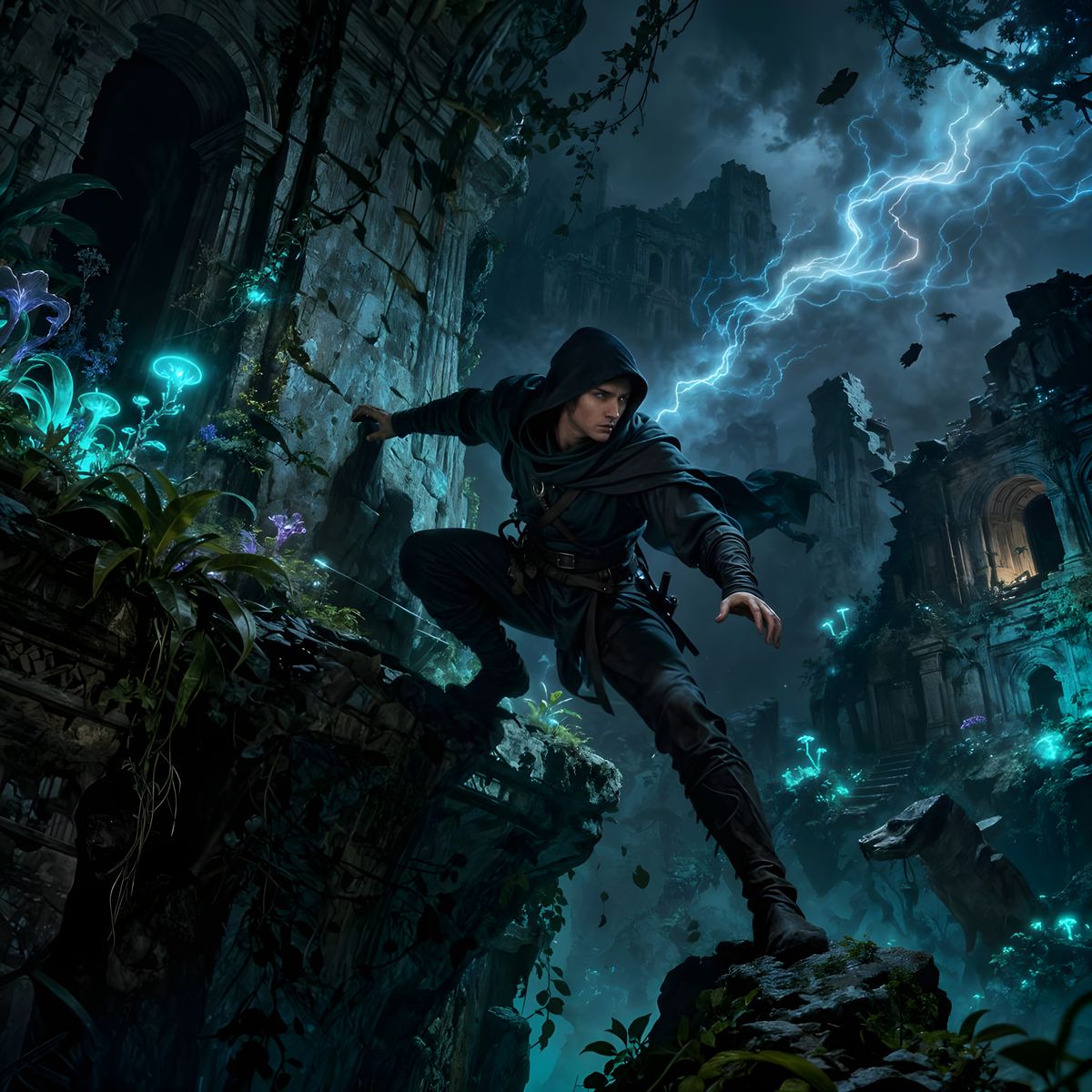 This image shows a stealthy thief moving through an ancient, overgrown ruin with bioluminescent plants. It features dark fantasy elements, crumbling structures, and pulsating mystical energy, rendered in a detailed matte painting style with dramatic lighting.