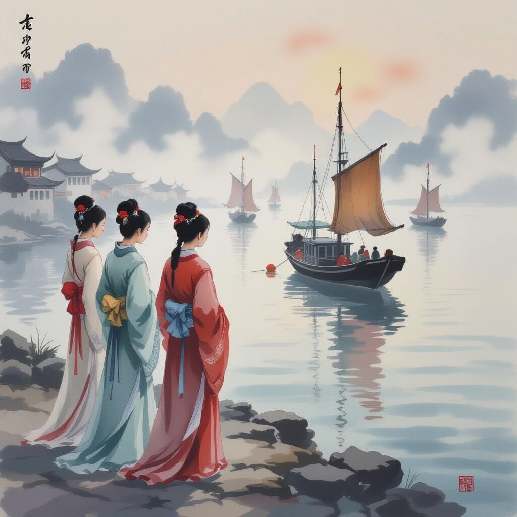 This image depicts Chinese women in traditional attire awaiting a fishing boat's return in a misty harbor. The artwork evokes a serene and atmospheric scene, with soft brushstrokes and a gentle color palette.