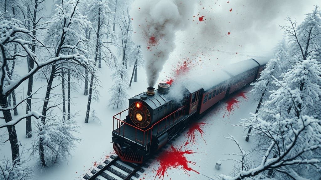 This image shows a surreal, intricately posed Asian landscape in a white winter forest, with close-up details of red blood drops ink painting, blended with a double exposure effect, in a dynamic, abstract expressionist style, reminiscent of high-contrast, cinematic art.