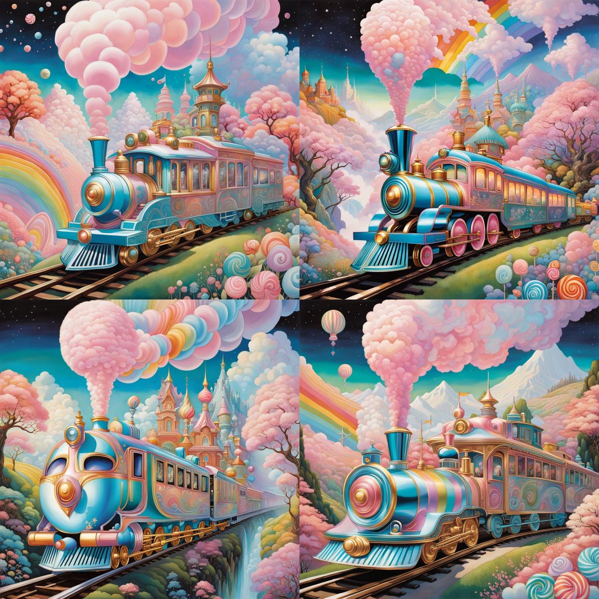 A vibrant toy train travels through a surreal landscape. This image features a pastel rainbow color palette and post-impressionistic elements, resembling a luminous, dreamlike collage.