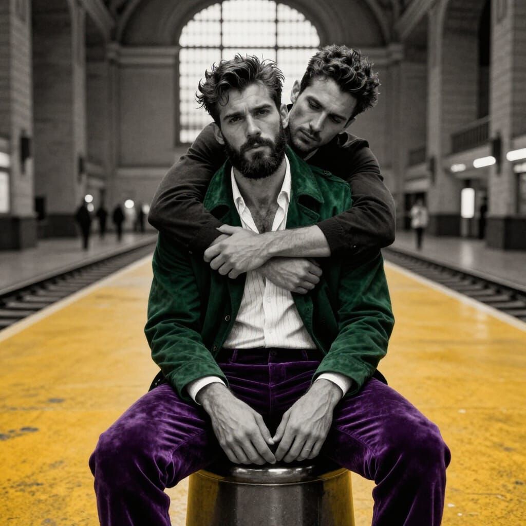 A hyper-masculine man with a scruffy look and troubling expression sits in a grand Art Deco railway station. This black and white portrait features dramatic lighting and a subtle film grain, reminiscent of 19th-century photography.