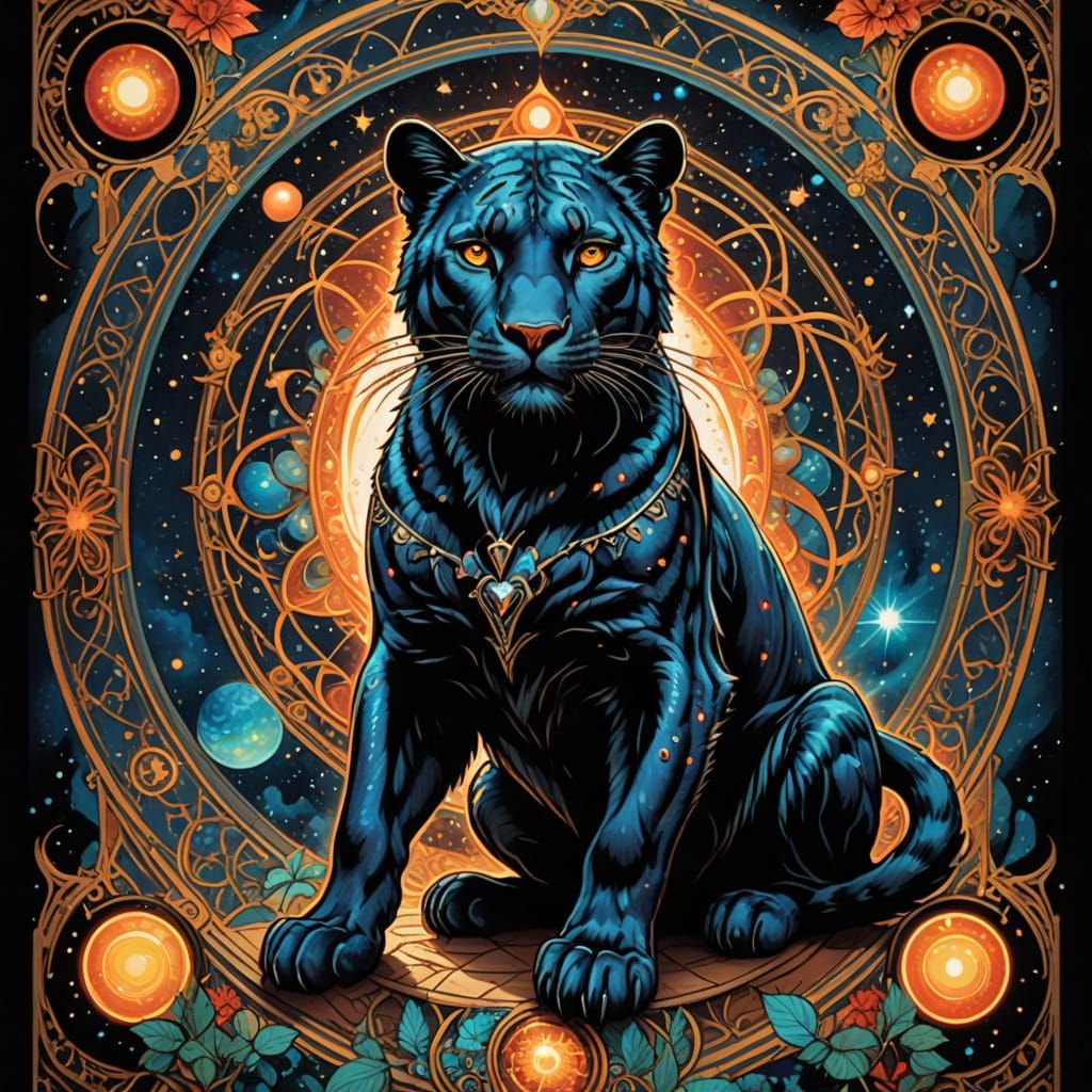 A vivid American traditional tattoo flash art image from above, showing a polka-dotted panther with heart-shaped spots. Metallic chrome accents add shine to this vibrant, glowing design.