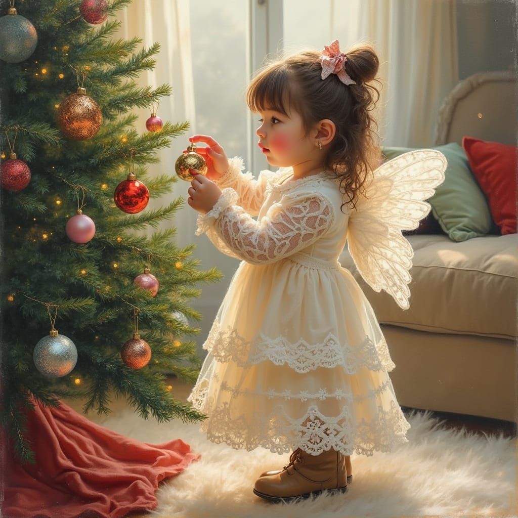 This image shows a sweet toddler girl in a detailed lace dress holding a Christmas ornament. The scene is rendered in an oil painting style with watercolor accents, capturing a hazy, decorated living room.