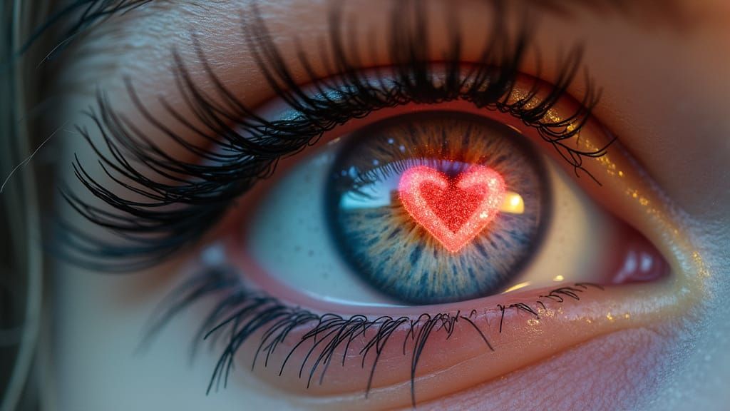 This image depicts a delicate, intricately detailed human eye with a soft focus glow, surrounded by lush eyelashes and vibrant colors, evoking a sense of wonder and enchantment with its dreamy, ethereal quality.