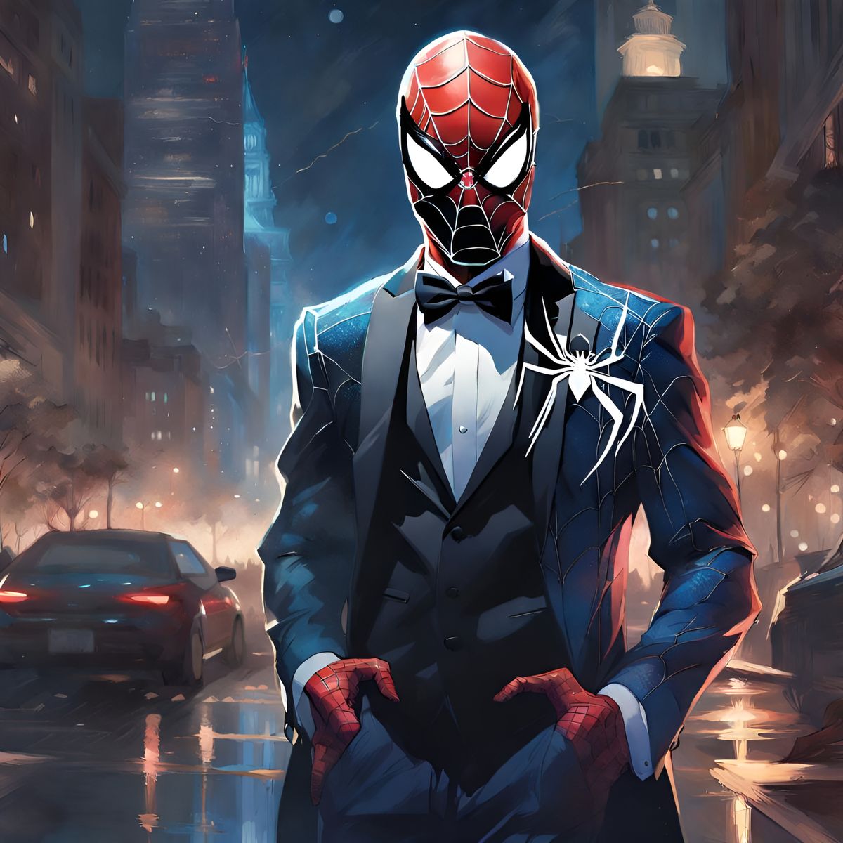 A detailed portrait of Spider-Man in a tuxedo against a moonlit backdrop. The art features intricate details and a cinematic quality, reminiscent of digital concept art.