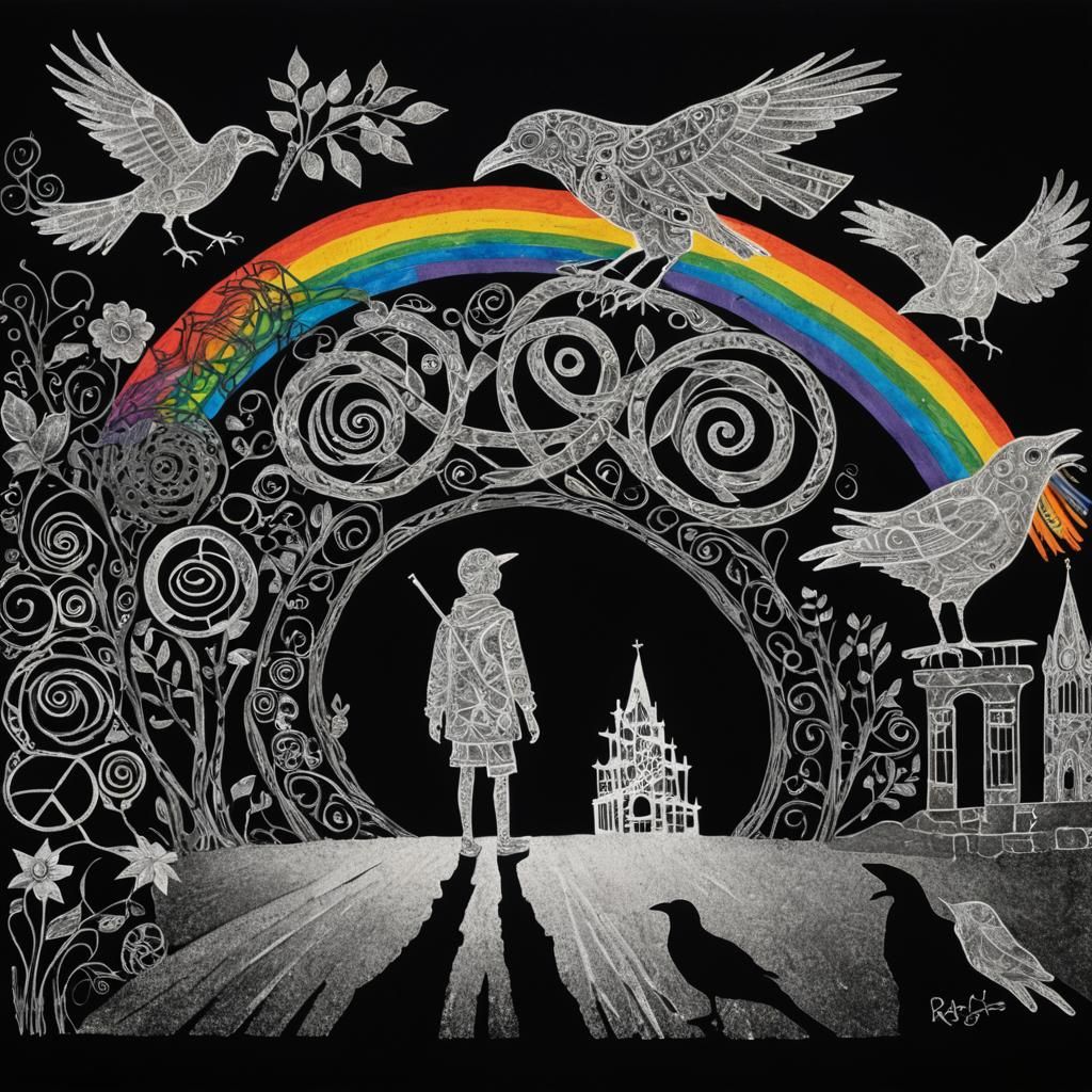This image shows a whimsical Celtic raven silhouette amidst seemingly random objects. The scene evokes a child's crayon drawing aesthetic with a single luminous rainbow fairy, set against a dark backdrop in alcohol ink.