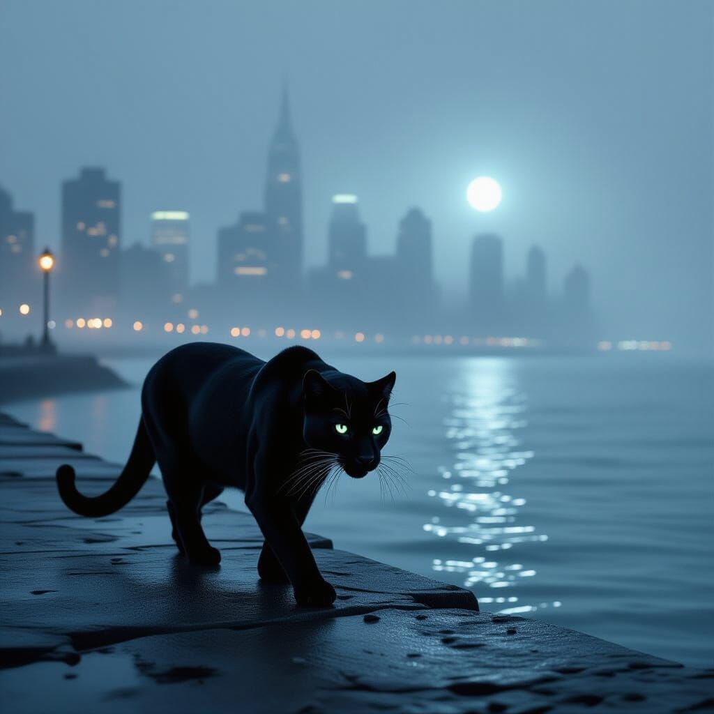 A dramatic image of a black panther prowling a misty harbor at night. The scene is lit by a distant cityscape, creating an atmosphere of noir and surrealism.