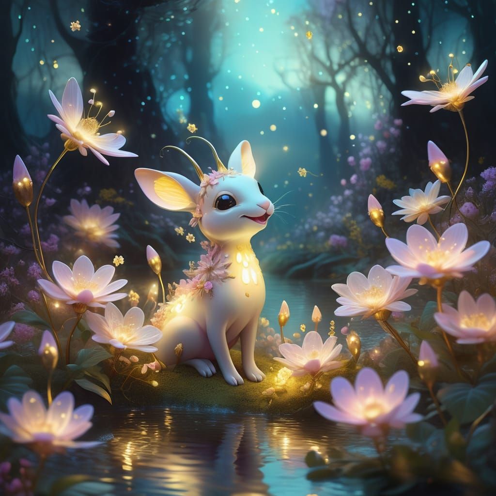 This image captures a cute, whimsical creature in a magical glade with glowing flowers and dancing sprites. Rendered in a pastel palette with gold highlights, it evokes a dreamlike fantasy atmosphere.