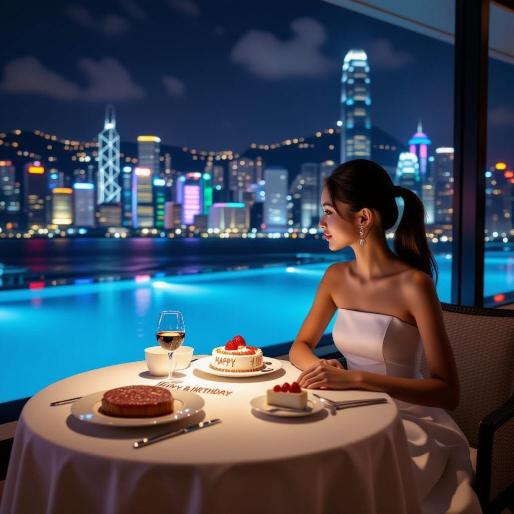 This image shows a schoolgirl in a white dress at a hotel near a pool, viewing the Hong Kong Airport at night. It's a hyperdetailed, cinematic digital artwork with a wide-angle perspective, capturing a vibrant city nightlife glow.