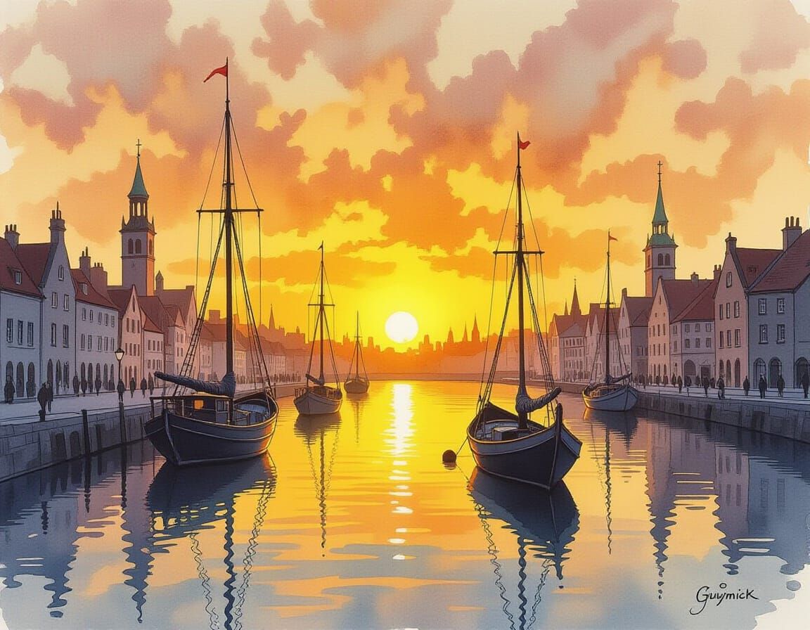 A vibrant image of a harbour bathed in the warm glow of sunrise. This detailed illustration features mystical symbols and fantastical influences, rendered in watercolour and ink with a 60-30-10 colour harmony.