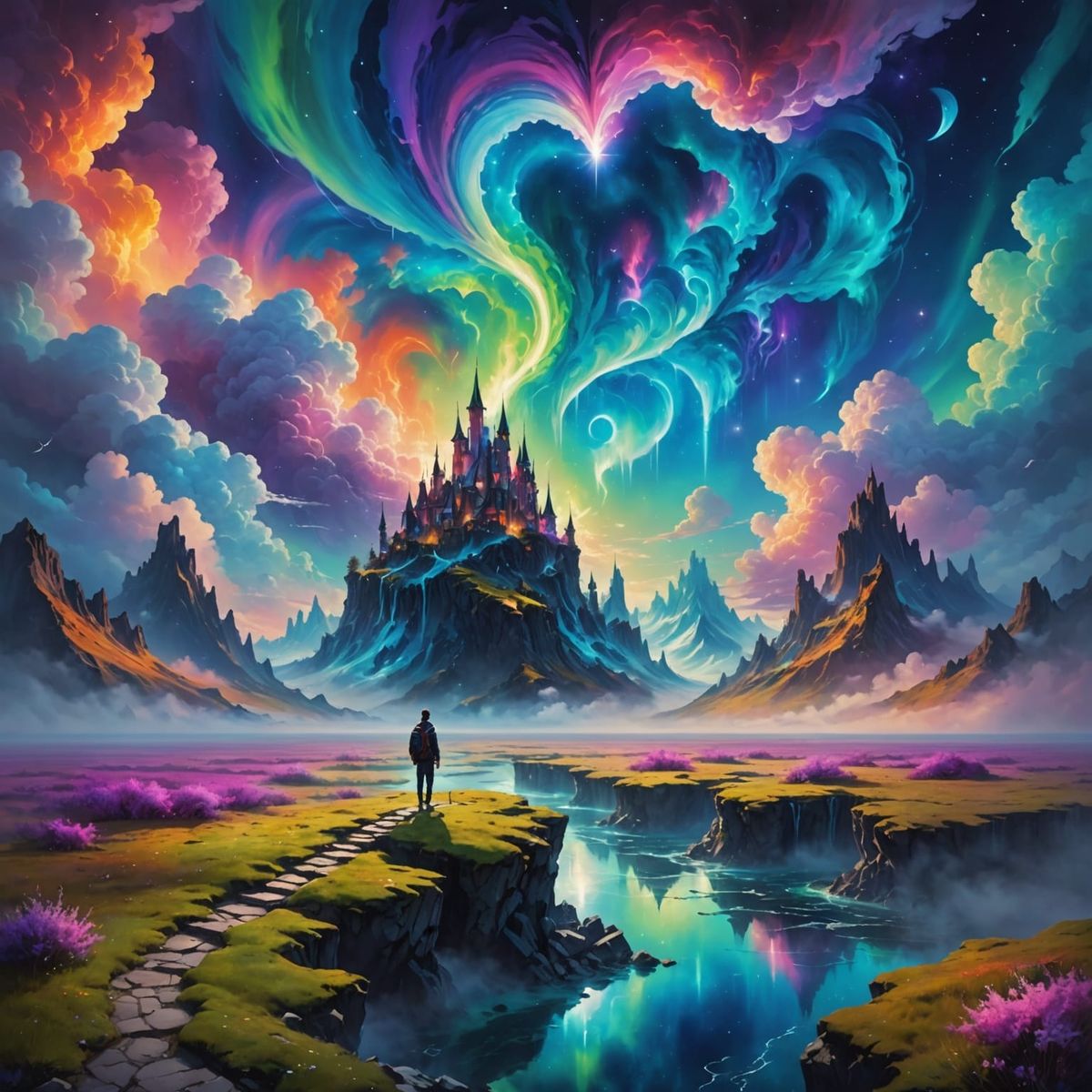 A surreal, magical dreamscape with vibrant, swirling clouds and auroras. A lone figure stands with anticipation, bathed in ethereal light, creating a whimsical and hopeful fantasy scene.
