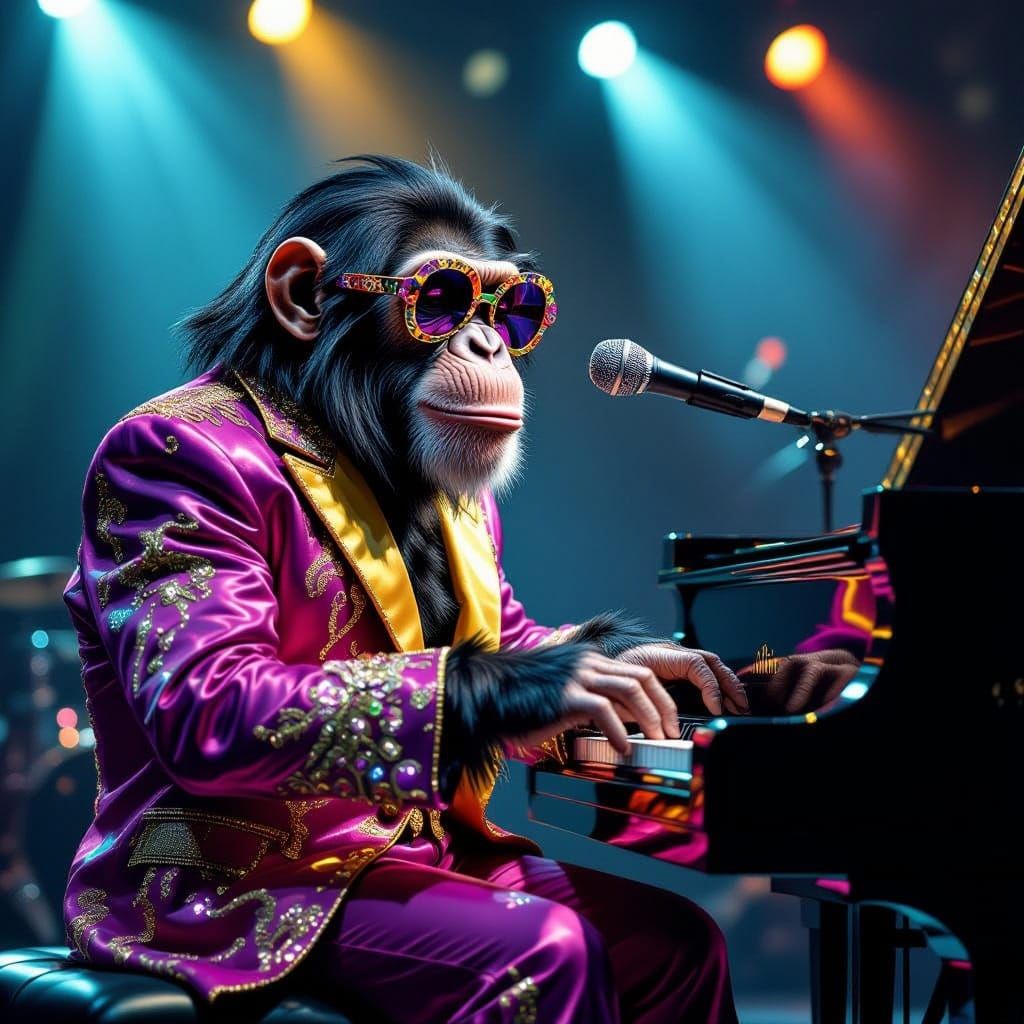 This hyperrealistic image shows a chimpanzee in a flamboyant Elton John costume playing a grand piano on stage with vibrant lighting and detailed textures.