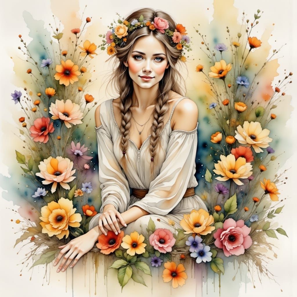 A watercolour painting of a whimsical woman encircled by a floral wreath. She is dressed in flowing bohemian clothing and illuminated by soft lighting. The art is rendered in a delicate watercolour style.