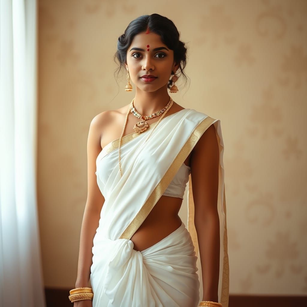 This image shows a young Indian woman in a white saree and bra, adorned with gold jewelry, in a confident pose. The image blends traditional and contemporary Indian aesthetics with soft natural light.