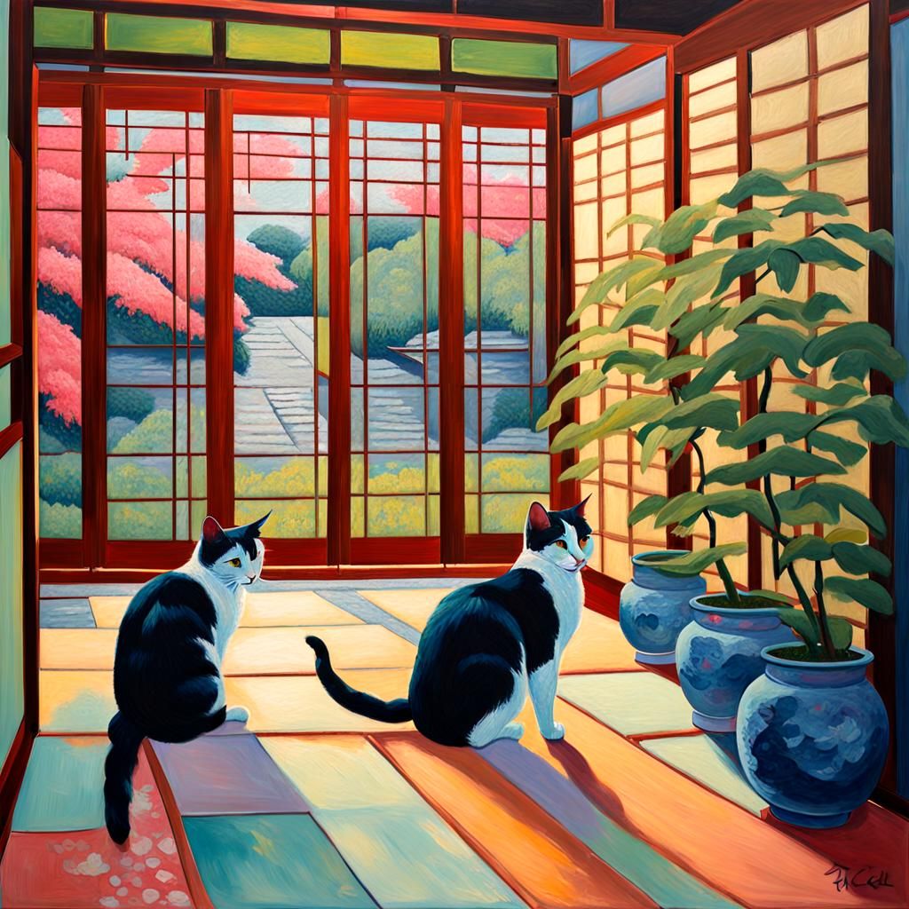 A vibrant neo-impressionistic painting of cats exploring a corridor. The scene features shoji screens, a tranquil garden, and thick layers of colorful textured paint in an expressionist style.