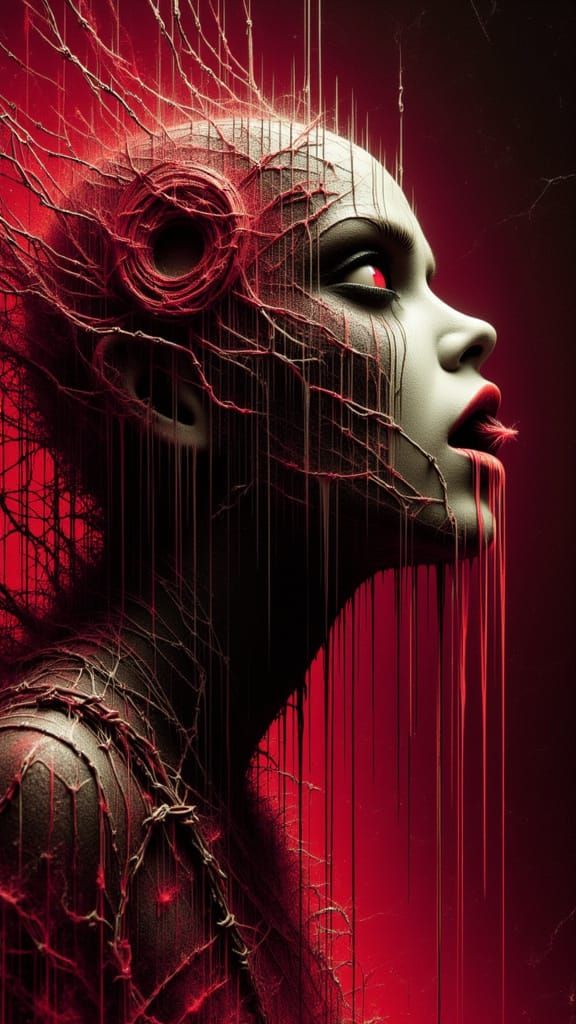 This striking image depicts unique, unholy women embodying iconic fear with a crimson energy. Created in a horror movie illustration style, reminiscent of classic comic art.