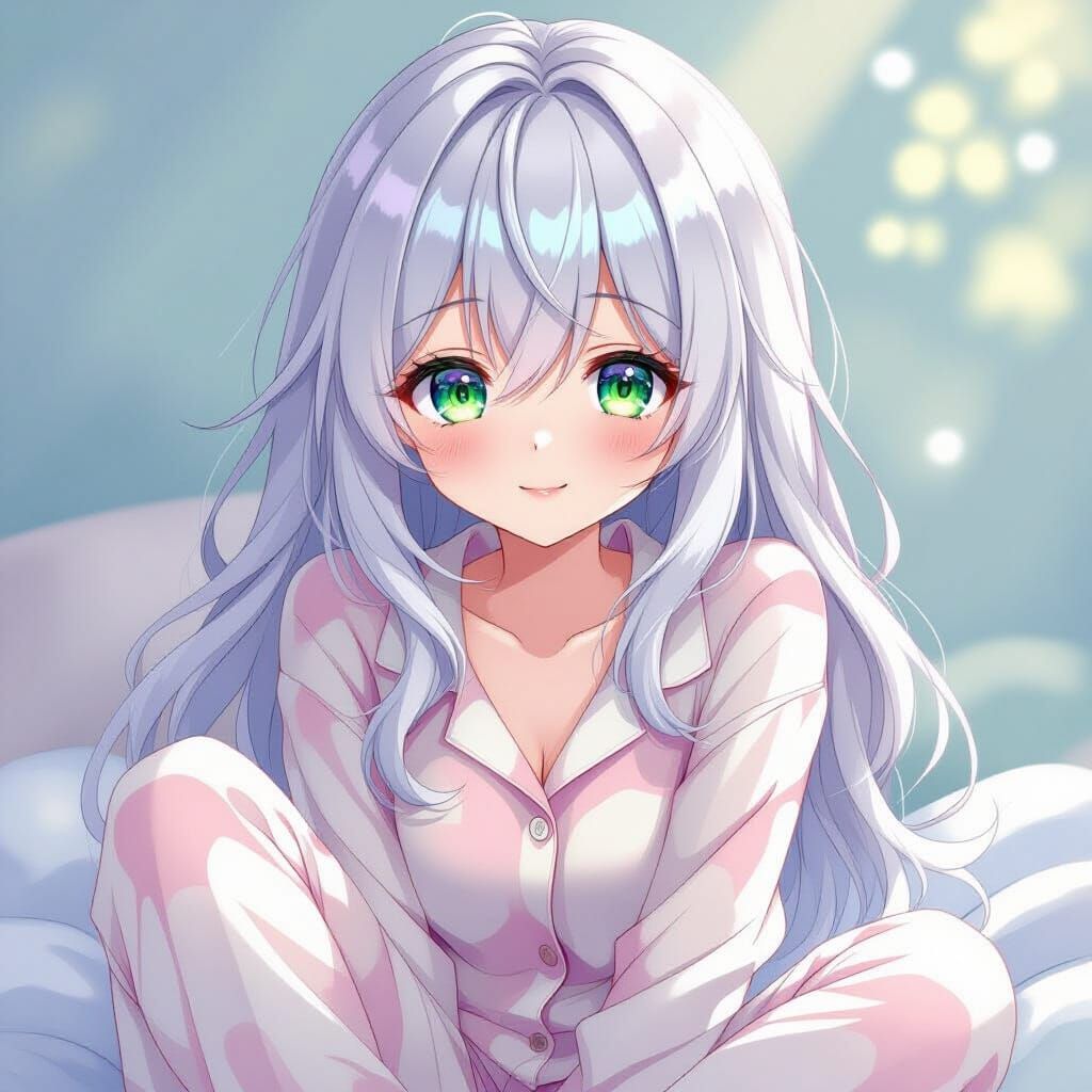 This image shows an anime girl with striking green eyes and pastel blonde-silver hair, wearing pajamas. The artwork is in a dreamy manga style with delicate lines and watercolor textures.