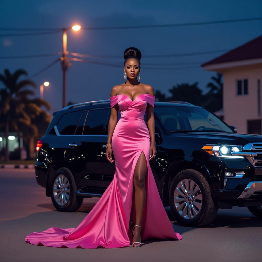 This image shows a glamorous woman stepping out of a black SUV at night. The scene is illuminated by streetlights creating long shadows, capturing a moment of tense anticipation with vibrant colors and dramatic lighting.