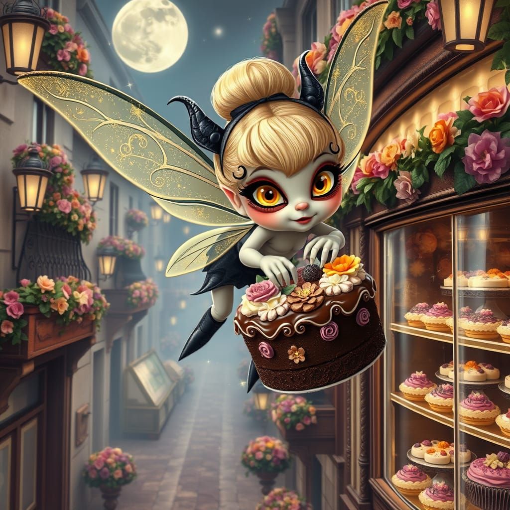 This enchanting, gothic-inspired image features a whimsical vampire Tinker Bell flying through a dreamy, misty atmosphere, surrounded by patisserie-lined streets, vibrant flowers, and a decadent chocolate cake, infused with an ethereal, otherworldly quality reminiscent of fantasy art.