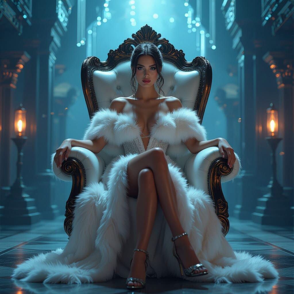 This image shows an elegant angel woman with refined features in a cyberpunk aesthetic. She is wearing a luxurious dress and seated on a majestic chair, surrounded by opulent architecture with neon accents and soft lighting.