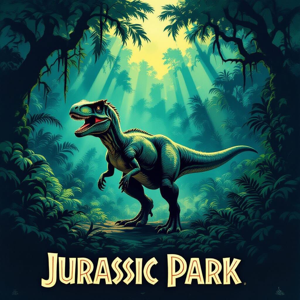 Generate unique movie posters like this one! Easily create your own Jurassic Park-inspired art with our free AI tool.